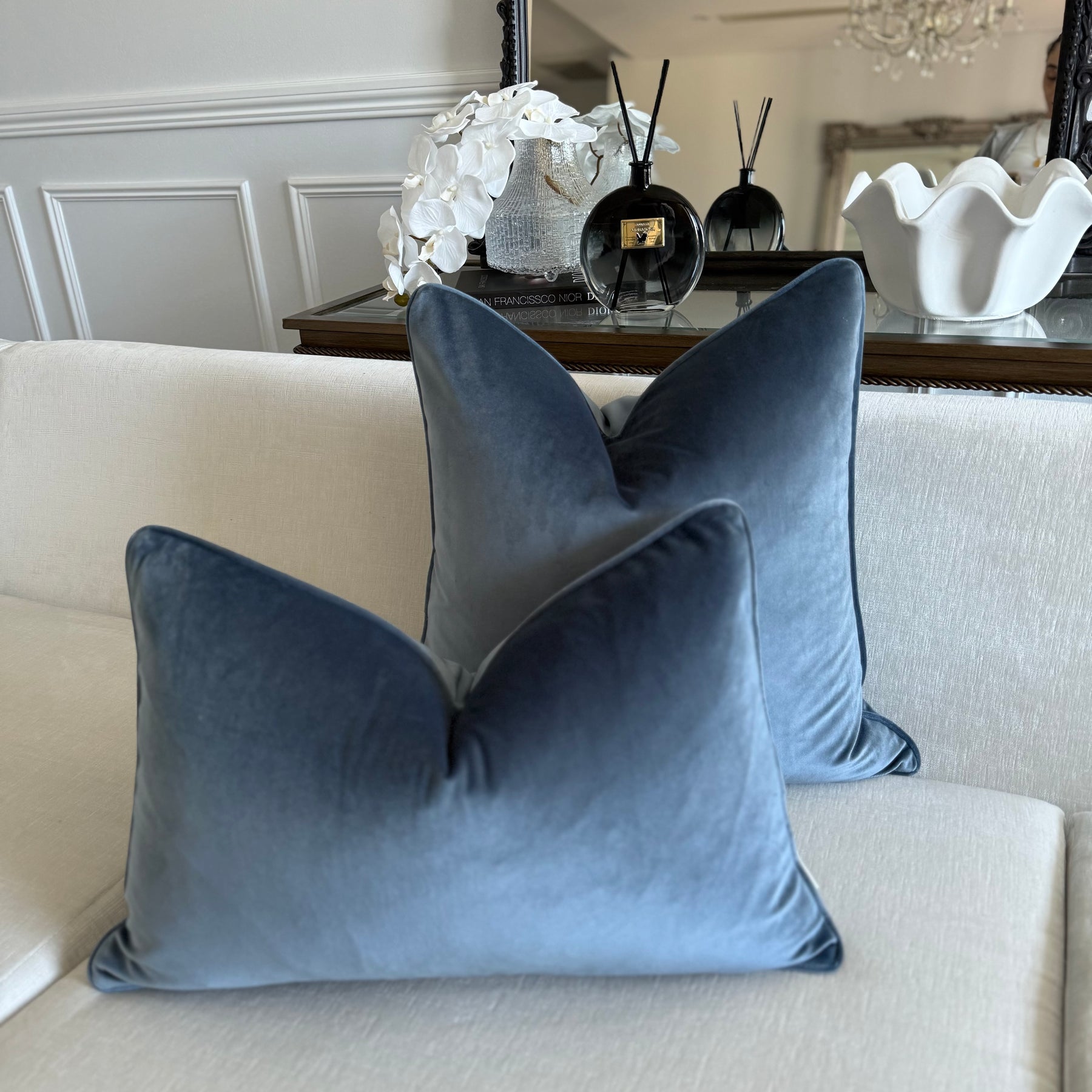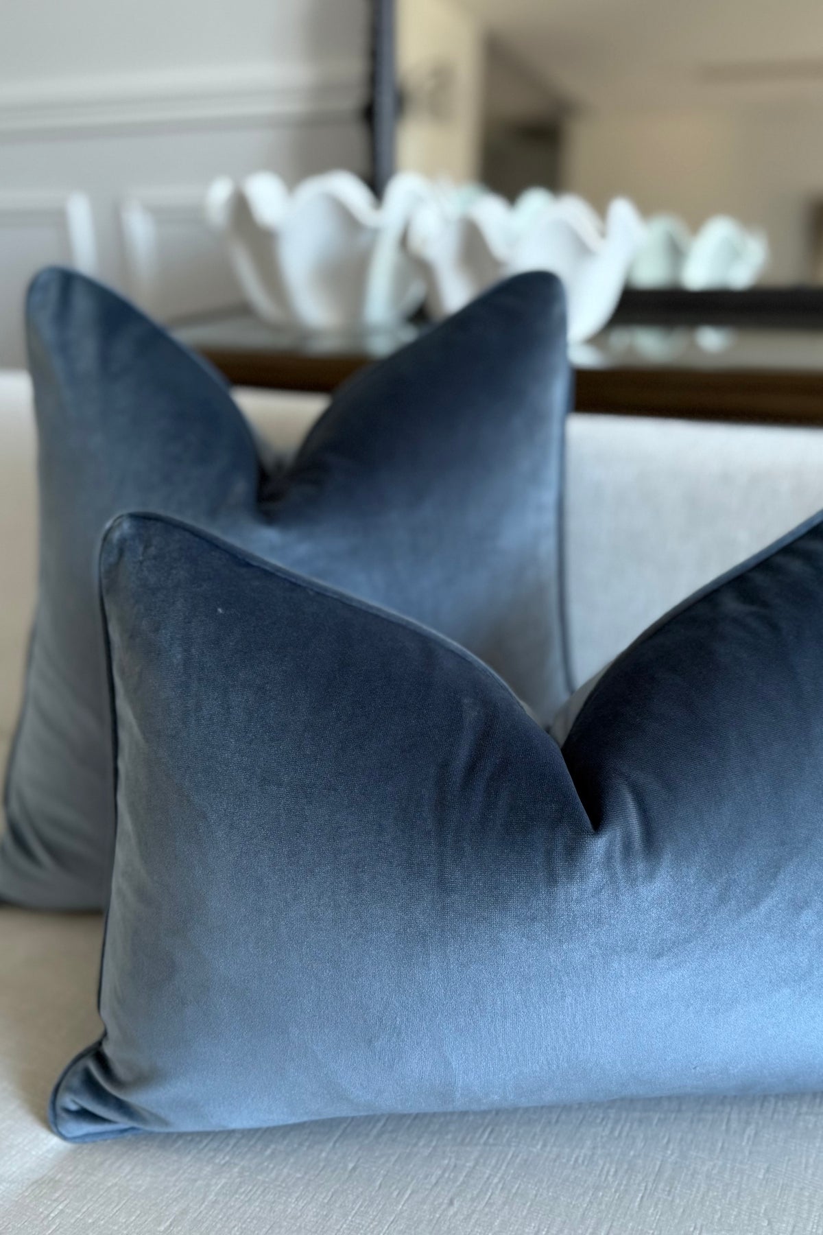 Stone blue cotton velvet cushion