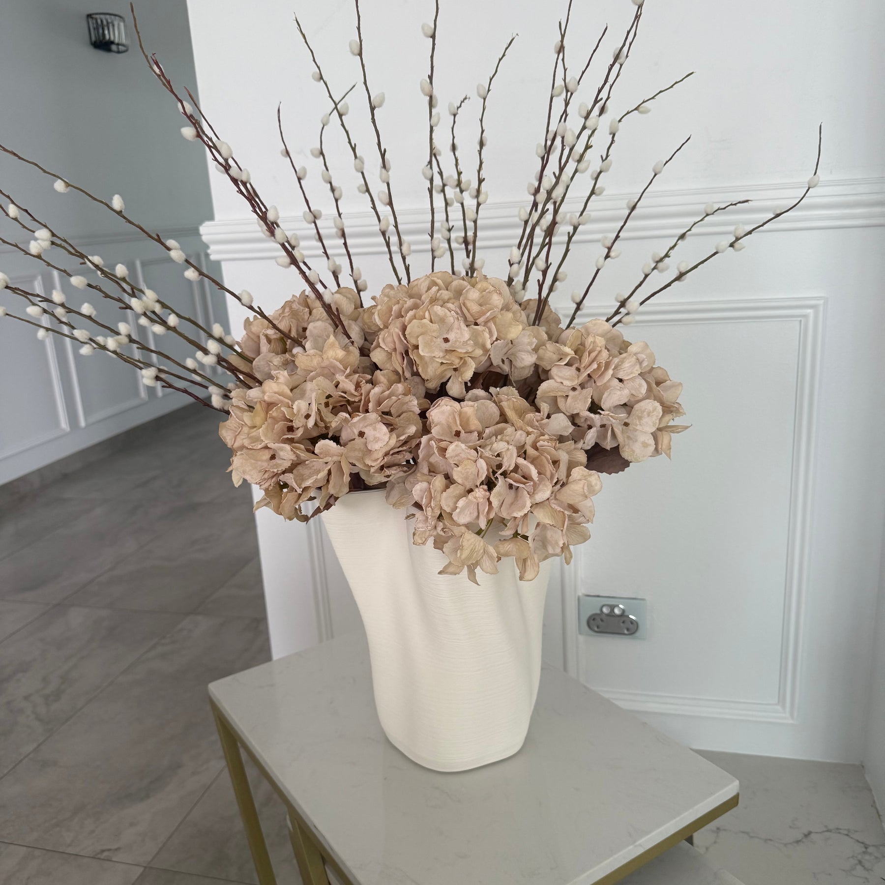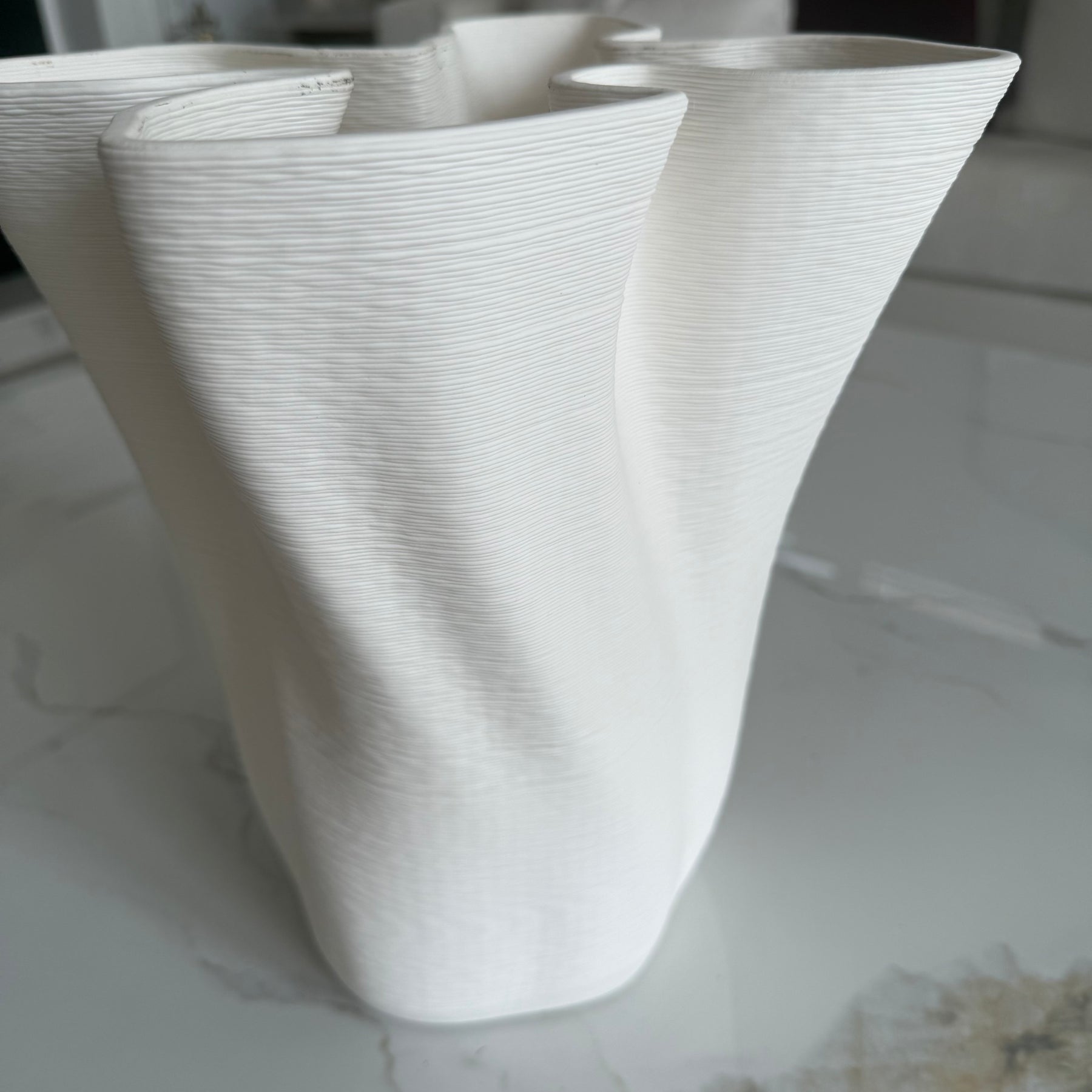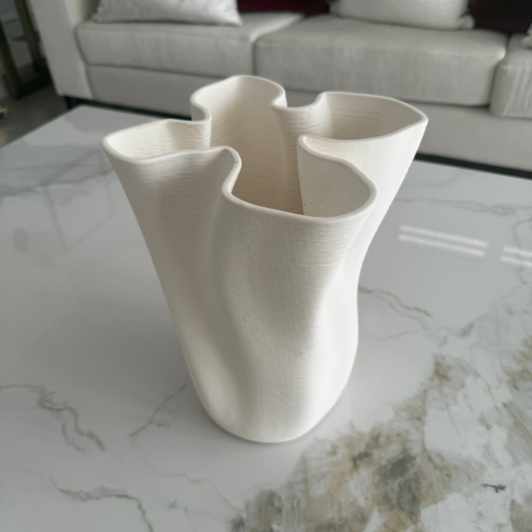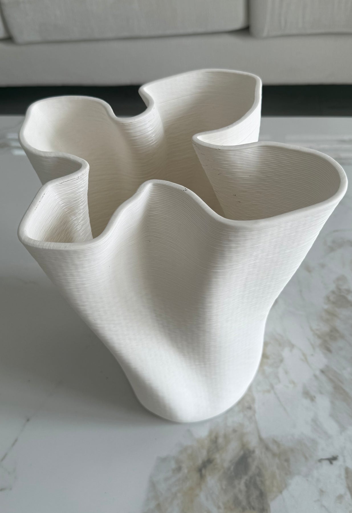 This very impressive sculptural 3D-printed vase in ivory is perfect for faux flowers or as a decorative piece. For adding water, simply insert a small waterproof vessel inside the pot.