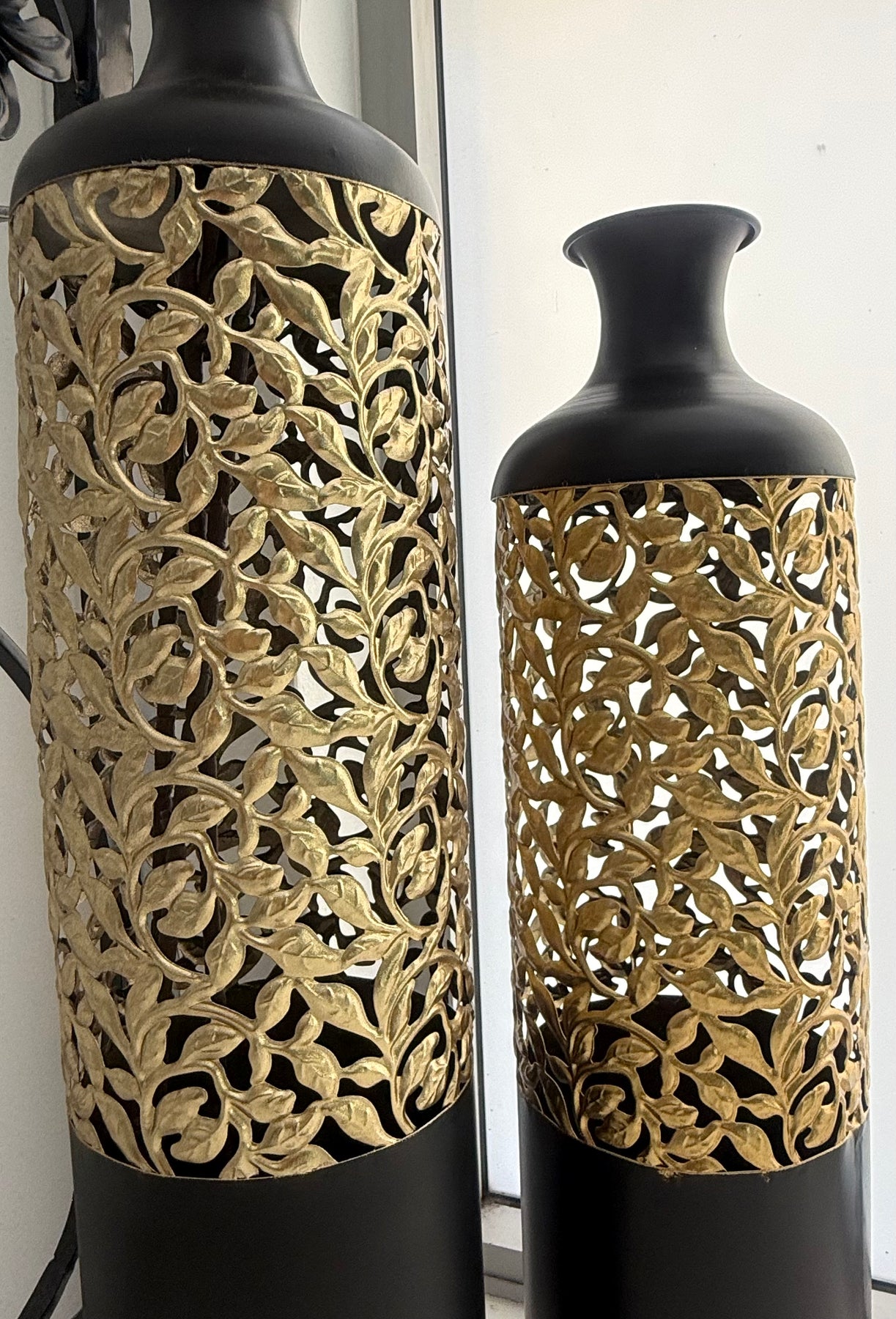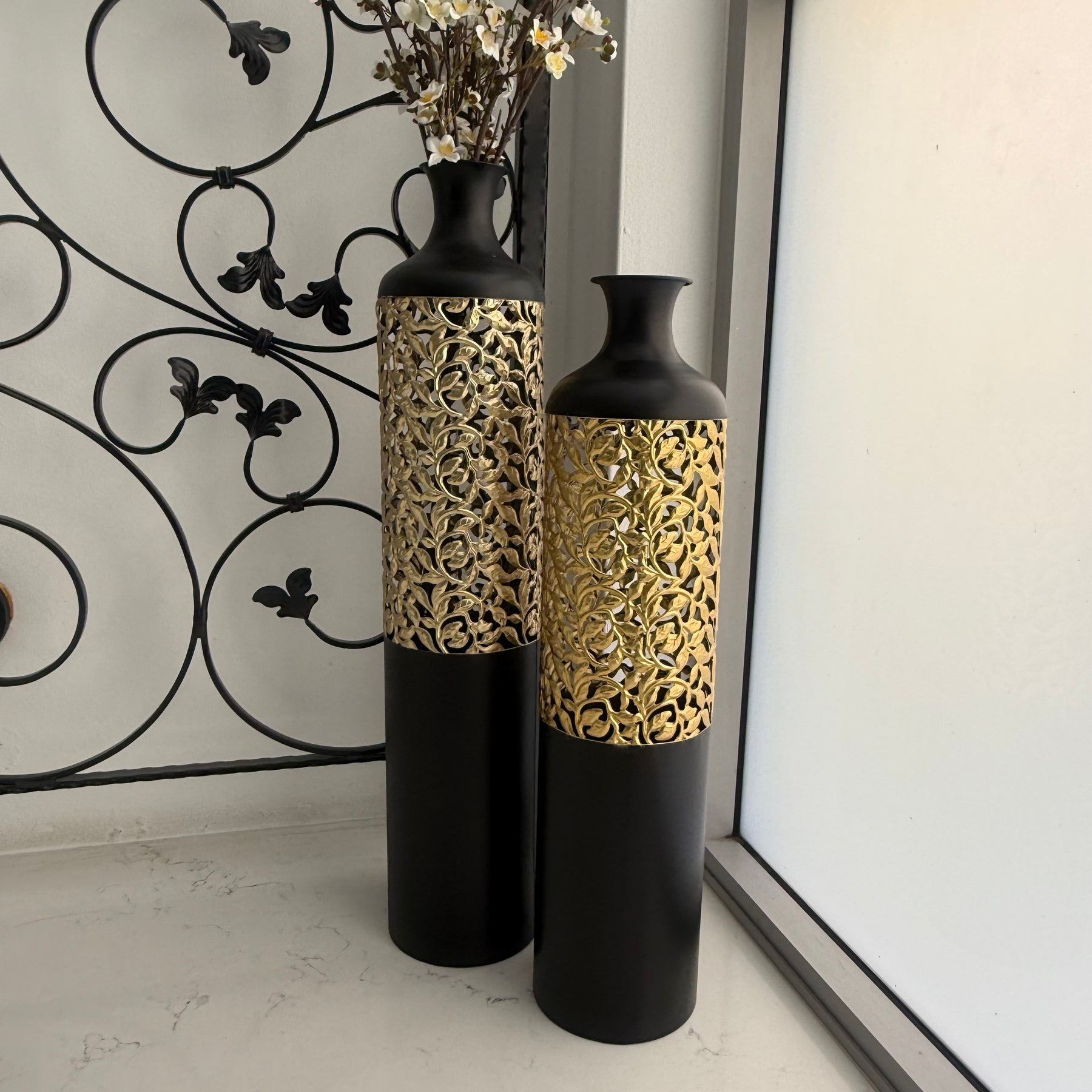 The black Gold Metal Floor Vase offers endless possibilities. Fill it with towering branches for a dramatic effect, fresh flowers for a pop of color, or simply leave it empty as a striking standalone piece.